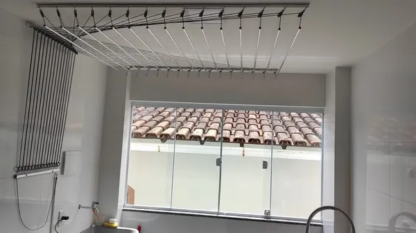 O varal de teto é uma solução funcional para otimizar espaços internos, especialmente em lavanderias compactas.
